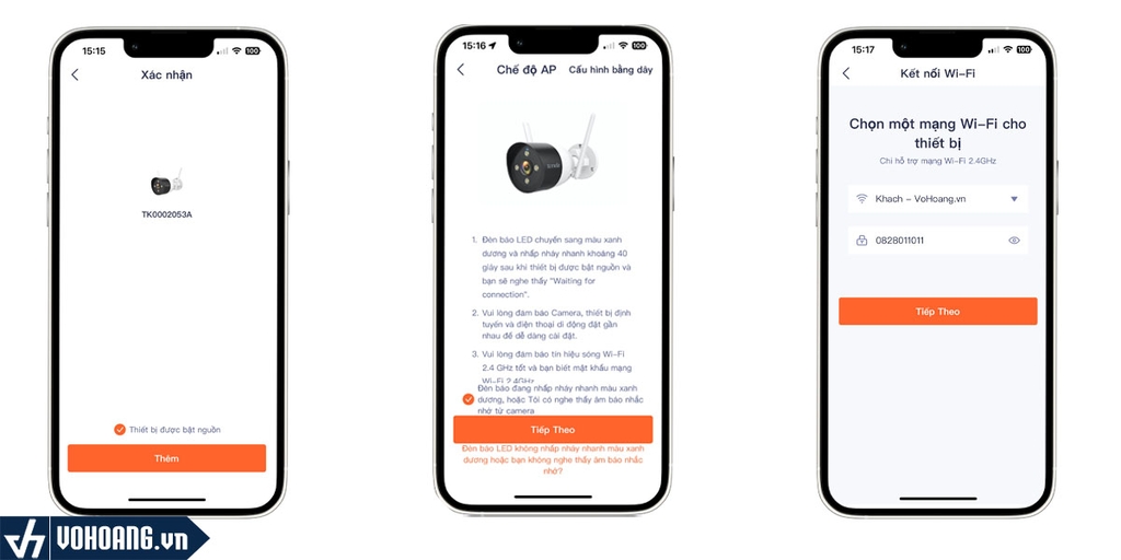 Bước 5: Hãy tích vào các yêu cầu để đồng ý điều khoản cài đặt thiết bị. Sau đó hãy chọn wifi muốn thêm vào thiết bị và nhập mật khẩu. Lưu ý: Camera chỉ hỗ trợ wifi băng tần 2.4Ghz.