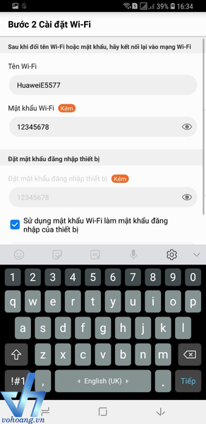 - Ngay sau khi đăng nhập thành công ta sẽ được chuyển đến phần cài đặt wifi cho thiết bị và thay đổi luôn mật khẩu quyền truy cập ứng dụng của thiết bị khi sử dụng với ứng dụng Huawei HiLink