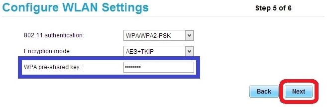 Step 5 of 6, đây là các thông số cấu hình password, có thể bỏ qua nếu là người không chuyên, chỉ cần nhập password mới mà mình muốn cài đặt vào ô WPA pre-shared key, sau đó chọn Next.