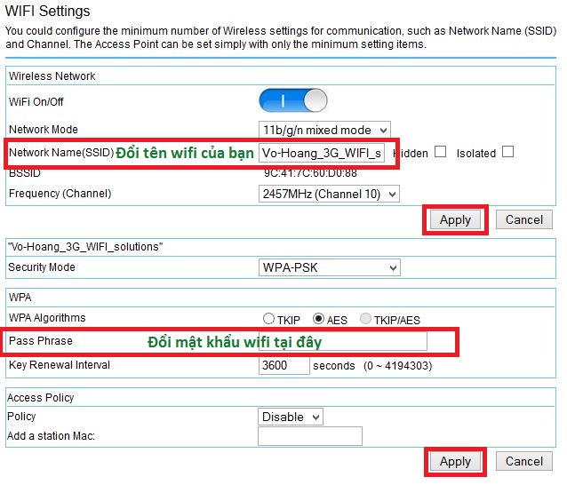 Bước 5: Đổi mật khẩu kết nối wifi. Tương tự như việc đổi tên ở Bước 4, bạn thay đổi mật khẩu mong muốn ở ô "Pass Phrase". Sau đó nhấn Apply. Mật khẩu mới sẽ được áp dụng ngay lập tức.