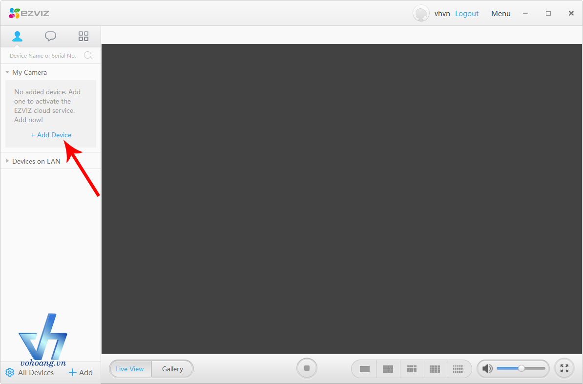 Bước 4 : Sau khi đăng nhập, bạn có thể bắt đầu thêm thiết bị vào phần mềm quản lý trên máy tính. Đầu tiên hãy nhấp vào “+ Add Device”.