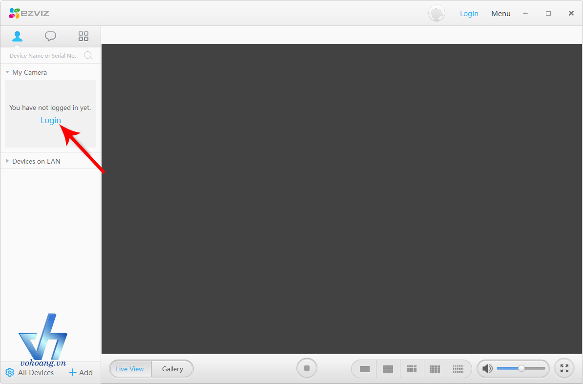 Bước 3 : Phần mềm sẽ tự khởi động vào giao diện chính. Trước tiên ta cần nhấp chuột vào dòng chữ Login để đăng nhập vào tài khoản Ezviz.