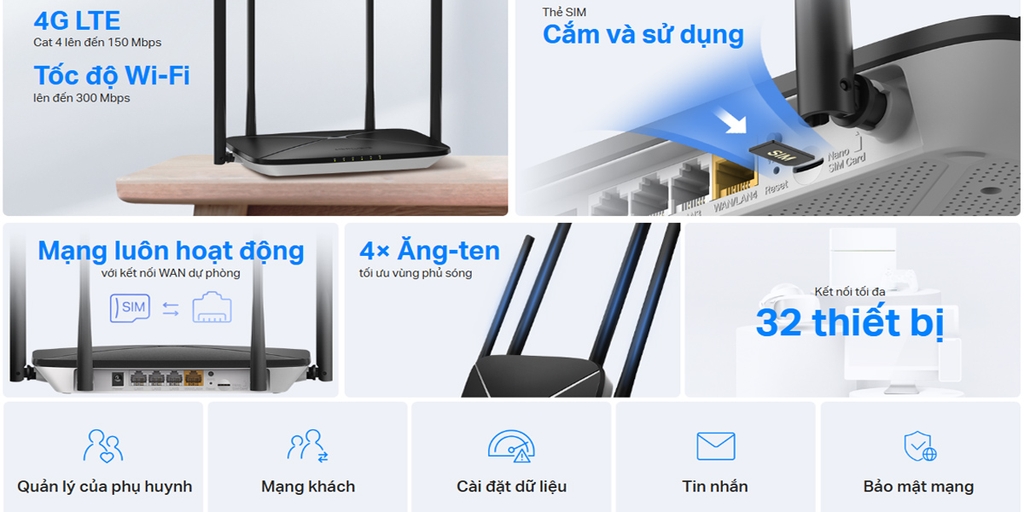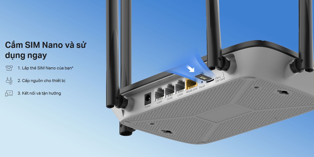 Cổng kết nối | 1× 10/100Mbps LAN/WAN Port 3× 10/100Mbps LAN Ports 1× Nano SIM Card Slot |
