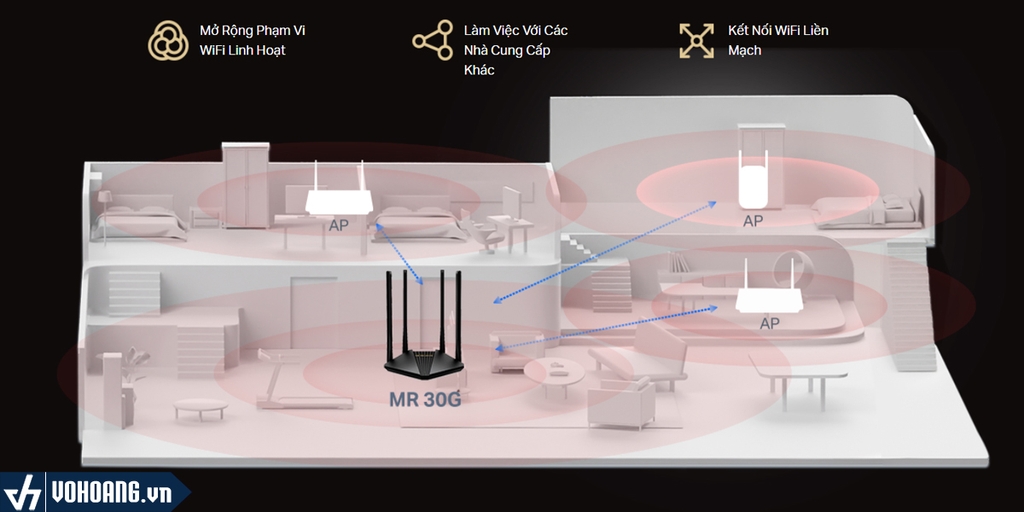 MR30G giải phóng toàn bộ tiềm năng mạng của bạn bằng cách tăng cường truyền tín hiệu bằng bộ khuếch đại công suất và tăng tốc thu tín hiệu bằng bộ khuếch đại có độ nhiễu thấp. Điều này có nghĩa là WiFi tại nhà của bạn có phạm vi phủ sóng và cường độ tín hiệu đầy đủ được cải thiện cho mọi thiết bị.