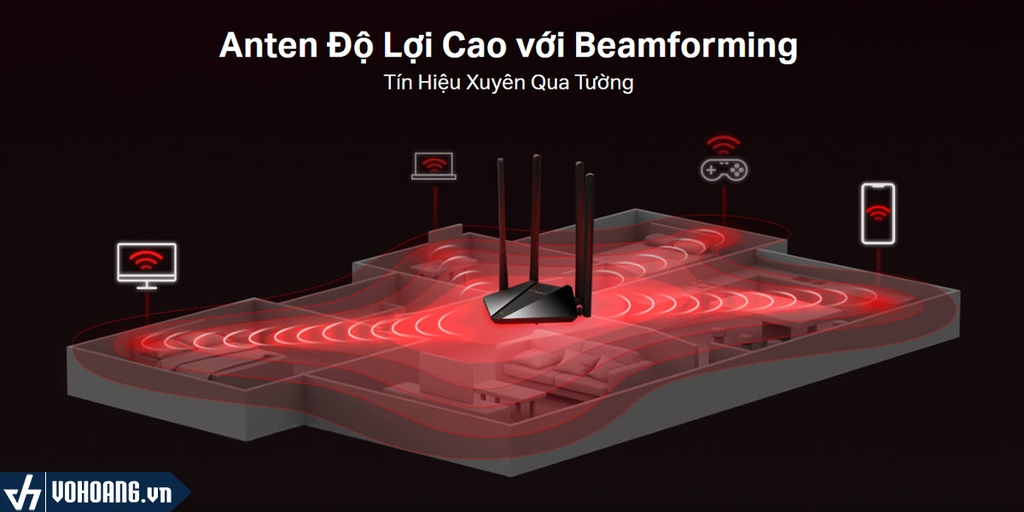 Bốn ăng-ten bên ngoài có công suất cao 5 dBi với cấu trúc bên trong được thiết kế tốt giúp tăng đáng kể hiệu suất truyền dẫn, phủ sóng nhiều phòng hơn. Công nghệ Beamforming nâng cao tự động định vị các thiết bị không dây và hình thành các kết nối không dây có mục tiêu, hiệu quả cao, giúp kết nối của bạn ổn định hơn.