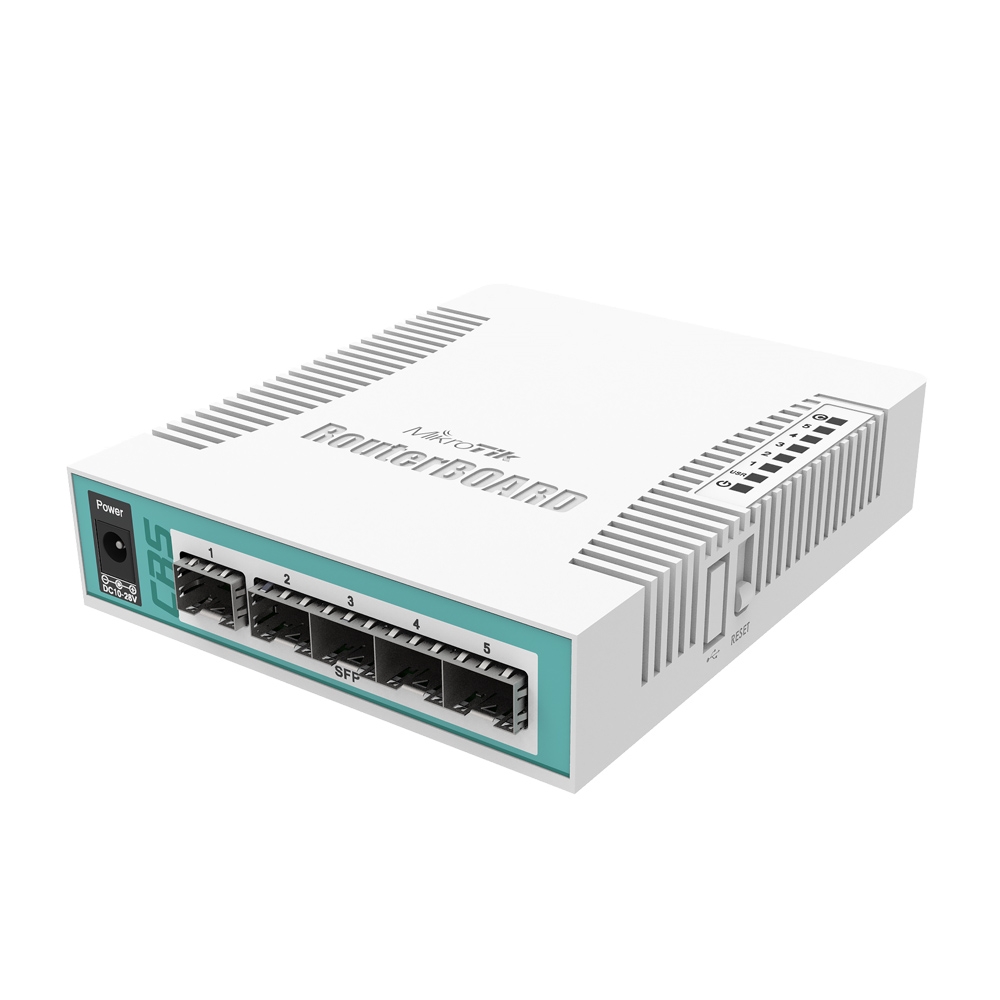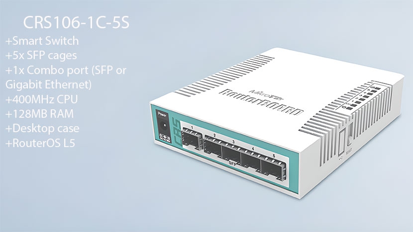 Cloud Router Switch 106-1C-5S là một thiết bị chuyển mạch thông minh kích thước để bàn, được trang bị 1 cổng kết hợp Gigabit Ethernet / SFP và 5 khe cắm SFP 1,25Gbps. Bộ sản phẩm bao gồm một bộ nguồn. Được trang bị CPU 400MHz và RAM 128MB, thiết bị chạy RouterOS với 5 License và hỗ trợ nguồn 11-30V.