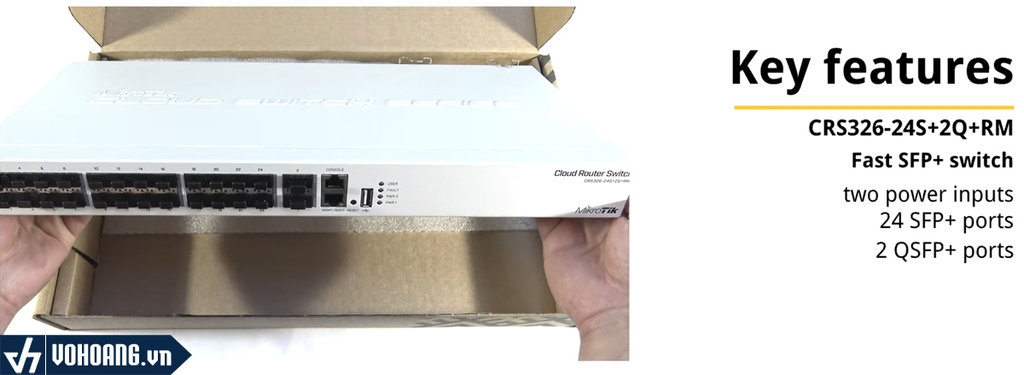 Nhìn chung, CRS326-24S+2Q+RM có 2 cổng QSFP+ 40 Gbps và 24 bốn cổng SFP+ 10 Gbps, cung cấp tổng thông lượng không chặn là 320 Gbps và khả năng chuyển mạch là 640 Gbps với tốc độ chuyển tiếp là 252 Mpps với hầu hết các gói tin phổ biến.