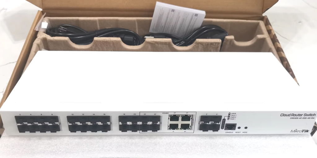 CRS328-4C-20S-4S+RM là một switch 24 cổng độc lập và 1 nhóm 4 cổng combo (RJ45/SFP) bao gồm 20 cổng SFP, 4 cổng SFP+ cho các mô-đun 10G và bốn cổng combo cho phép bạn chọn sử dụng cổng SFP hoặc RJ45 từ nhóm combo. Các cổng này cũng có thể được chọn bằng phần mềm, vì vậy nếu bạn đã cắm cả tám cáp, bạn có thể sử dụng tập lệnh để quyết định bốn cổng combo nào sẽ hoạt động.