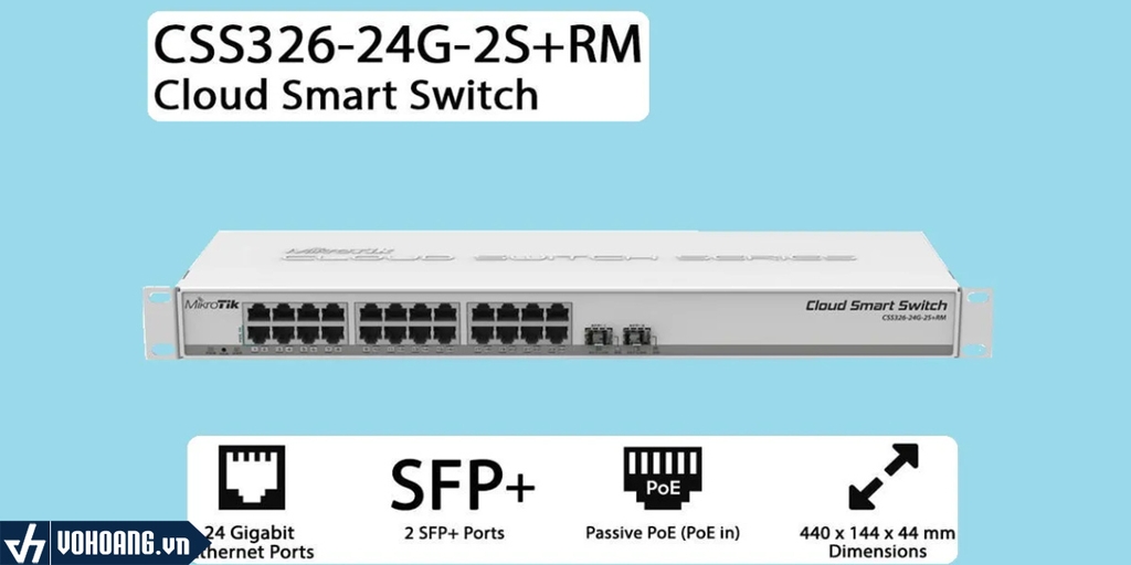 Cloud Smart Switch 326-24G-2S+RM là bộ chuyển mạch Gigabit Ethernet 24 cổng chạy bằng SwOS với hai cổng SFP+ trong vỏ gắn giá đỡ 1U, cung cấp kết nối tốc độ dây với một số tính năng chuyển mạch mới.