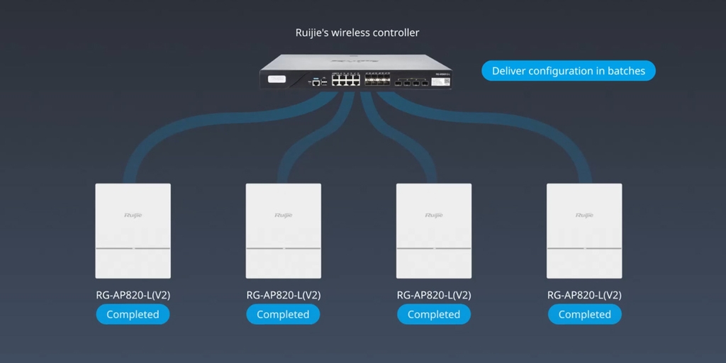 Bộ điều khiển không dây của Ruijie cung cấp cấu hình theo tự động từ Cloud, loại bỏ nhu cầu cấu hình trước AP trước khi cài đặt. Điều này cho phép tự động cung cấp và triển khai đơn giản, giảm độ phức tạp trong việc triển khai và bảo trì.