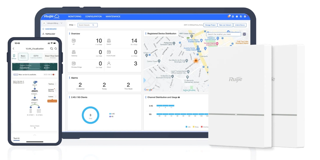 Bạn có thể làm đa số các tác vụ cơ bản thông qua hệ thống Ruijie Cloud chỉ bằng một vài thao tác đơn giản: Giám sát hệ thống, quản trị wifi từ xa, xác thực thông tin đăng nhập, tối ưu hóa toàn hệ thống chỉ với 1 nút bấm.