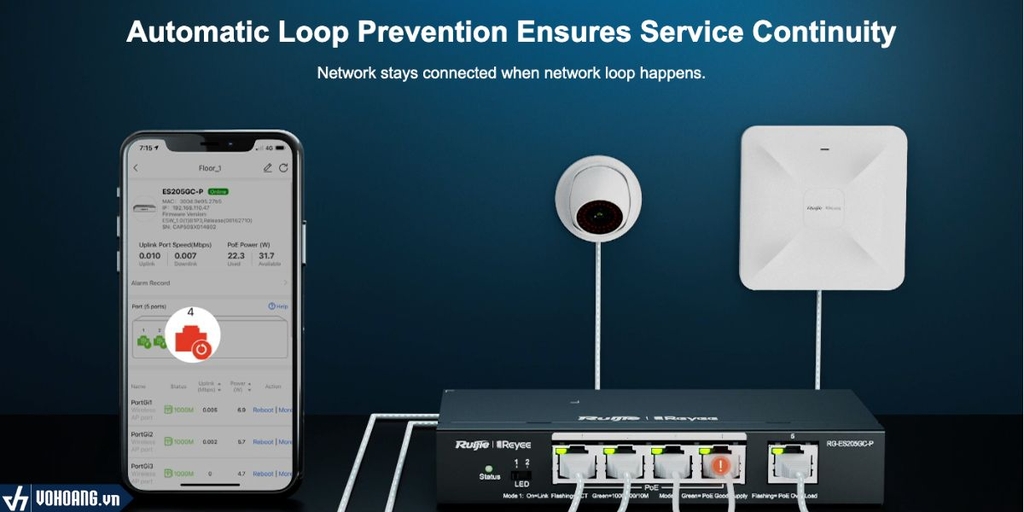 - Các thiết bị chuyển mạch giám sát thông minh không chỉ hỗ trợ quản lý giao diện web, mà còn hỗ trợ ứng dụng Switch Ruijie và quản lý từ xa trên nền tảng đám mây. Người dùng có thể xem trạng thái mạng, sửa đổi cấu hình và khắc phục sự cố tại nhà. Ngoài ra, cổng PoE có thể được khởi động lại từ xa để khởi động lại camera PoE bị lỗi.