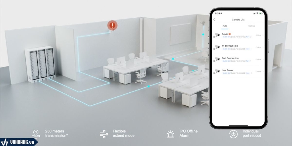 - Các công tắc giám sát thông minh cung cấp phân chia VLAN thuận tiện và linh hoạt, có thể tự động phân chia các VLAN khác nhau theo loại thiết bị được kết nối với cổng, để mạng giám sát và mạng dữ liệu không can thiệp lẫn nhau, cải thiện tính ổn định của toàn bộ mạng.