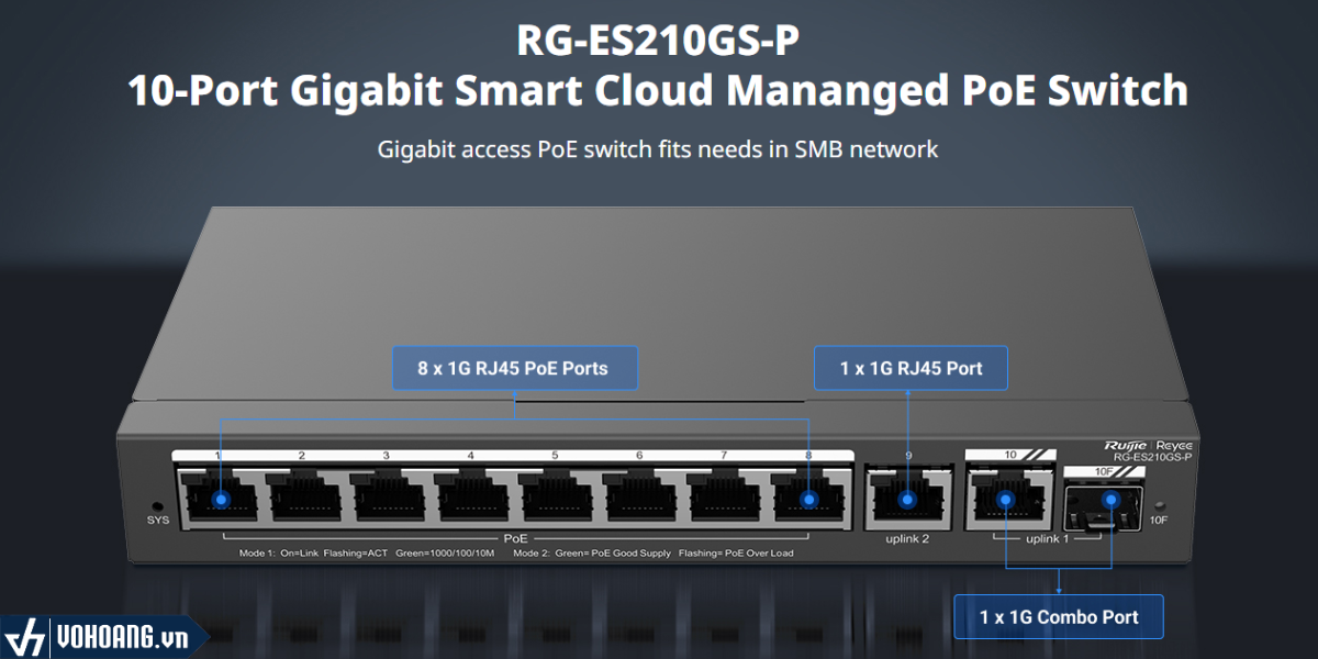 Ruijie RG-ES210GS-P là switch PoE thông minh quản lý qua đám mây thuộc dòng Reyee, được thiết kế tối ưu cho các hệ thống mạng doanh nghiệp, văn phòng và camera giám sát. Thiết bị sở hữu 10 cổng Gigabit, trong đó 8 cổng PoE cung cấp nguồn trực tiếp cho camera IP, Access Point hoặc điện thoại IP, giúp triển khai linh hoạt và tiết kiệm chi phí. Hỗ trợ quản lý tập trung qua nền tảng Ruijie Cloud, RG-ES210GS-P mang đến khả năng giám sát, cấu hình và bảo trì từ xa tiện lợi. Hiệu năng ổn định, bảo mật cao cùng thiết kế chắc chắn khiến đây trở thành lựa chọn lý tưởng cho mọi hệ thống mạng hiện đại.