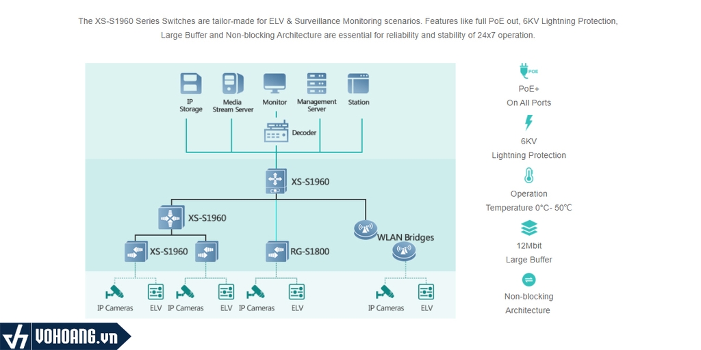 Ruijie XS-S1960-10GT2SFP-P-H là bộ chuyển mạch công nghiệp tiêu chuẩn L2,L3 cung cấp internet và nguồn cho các thiết đầu cuối với tổng công suất lên đến 125W được quản lý thông qua hệ thống Ruijie Cloud hoặc giao diện web trực quan. XS-S1960-10GT2SFP-P-H được thiết kế cho các doanh nghiệp lớn đang tìm kiếm giải pháp dễ triển khai trong việc liên kết mạng giữa các khu vực cũng như cấp nguồn PoE công suất lớn.