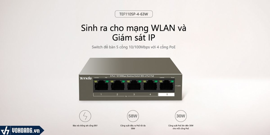 TEF1105P-4-63W là switch PoE Tenda cung cấp 5 cổng RJ45 10/100 Mbps Base-TX. Truyền tải khoảng cách lên đến 250 mét, vượt qua giới hạn truyền tải hiện tại hàng trăm mét. Cổng 1-4 hỗ trợ chuẩn IEEE 802.3at và chuẩn IEEE 802.3af PoE. Nó cung cấp công suất đầu ra PoE tối đa 30W trên mỗi cổng và 58W trên toàn bộ thiết bị.