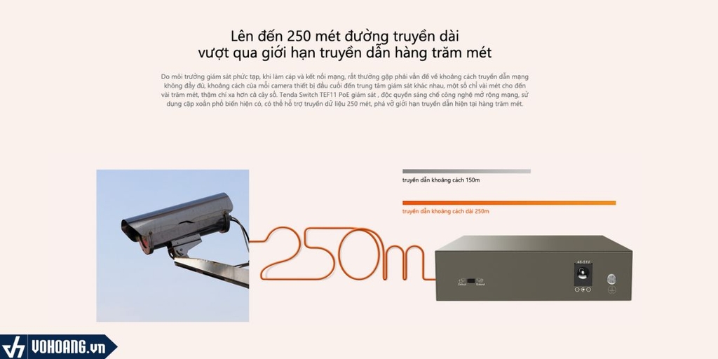 Do môi trường giám sát phức tạp, khi làm cáp và kết nối mạng, rất thường gặp phải vấn đề về khoảng cách truyền dẫn mạng không đầy đủ, khoảng cách của mỗi camera thiết bị đầu cuối đến trung tâm giám sát khác nhau, một số chỉ vài mét cho đến vài trăm mét, thậm chí xa hơn cả cây số. Tenda Switch TEF11 PoE giám sát , độc quyền sáng chế công nghệ mở rộng mạng, sử dụng cặp xoắn phổ biến hiện có, có thể hỗ trợ truyền dữ liệu 250 mét, phá vỡ giới hạn truyền dẫn hiện tại hàng trăm mét.