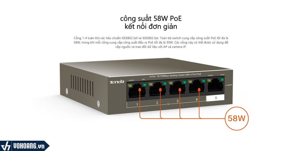 Cổng 1-4 tuân thủ các tiêu chuẩn IEEE802.3af và IEEE802.3at. Toàn bộ switch cung cấp công suất PoE tối đa là 58W, trong khi mỗi cổng cung cấp công suất đầu ra PoE tối đa là 30W. Các cổng này có thể được sử dụng để cấp nguồn và trao đổi dữ liệu với AP và camera IP.