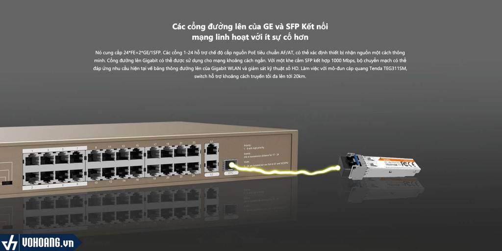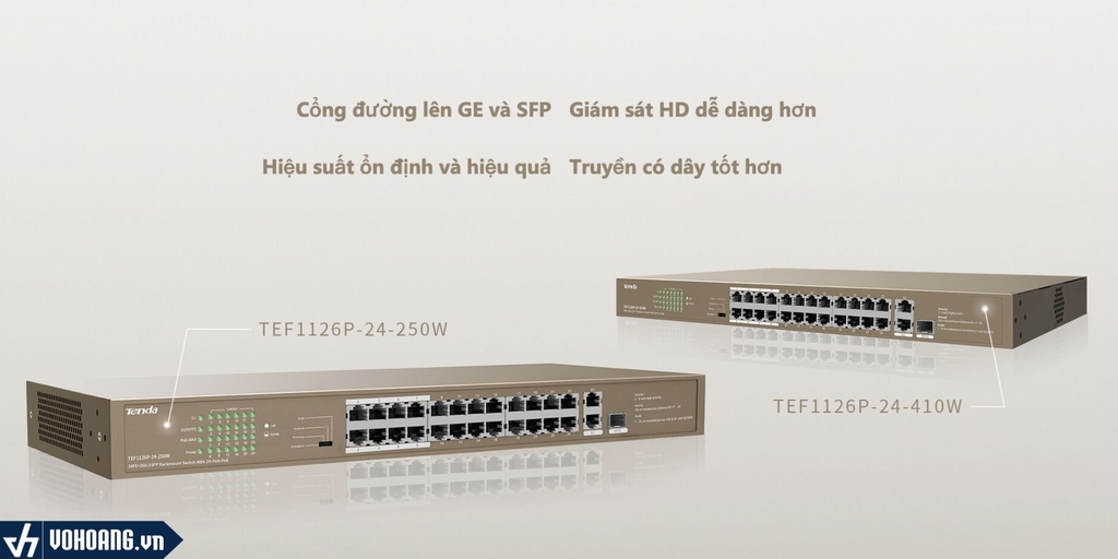 Nó cung cấp 24*FE+2*GE/1SFP. Các cổng 1-24 hỗ trợ chế độ cấp nguồn PoE tiêu chuẩn AF/AT, có thể xác định thiết bị nhận nguồn một cách thông minh. Cổng đường lên Gigabit có thể được sử dụng cho mạng khoảng cách ngắn. Với một khe cắm SFP kết hợp 1000 Mbps, bộ chuyển mạch có thể đáp ứng nhu cầu hiện tại về băng thông đường lên của Gigabit WLAN và giám sát kỹ thuật số HD. Làm việc với mô-đun cáp quang Tenda TEG311SM, switch hỗ trợ khoảng cách truyền tối đa lên tới 20km.