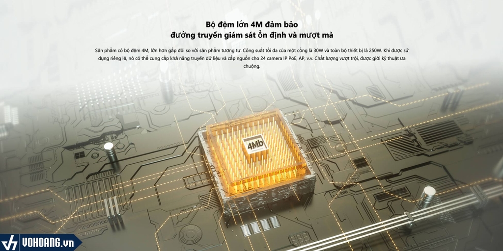 Sản phẩm có bộ đệm 4MB, lớn hơn gấp đôi so với sản phẩm tương tự. Công suất tối đa của một cổng là 30W và toàn bộ thiết bị là 250W. Khi được sử dụng riêng lẻ, nó có thể cung cấp khả năng truyền dữ liệu và cấp nguồn cho 24 camera IP PoE, AP, v.v. Chất lượng vượt trội, được giới kỹ thuật ưa chuộng.
