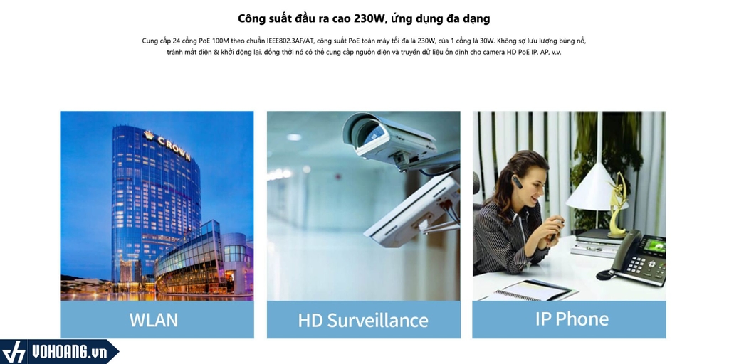 Với công suất đầu ra PoE tối đa là 230 W và 30 W cho một cổng, nó có thể cung cấp năng lượng khi truyền dữ liệu với các AP, camera IP và điện thoại IP. Công tắc hỗ trợ 4 chế độ làm việc, bao gồm chế độ tiêu chuẩn, ưu tiên, mở rộng và Vlan, là lựa chọn lý tưởng cho SMB, khách sạn, trường học, nhà máy có yêu cầu giám sát video và mạng không dây.