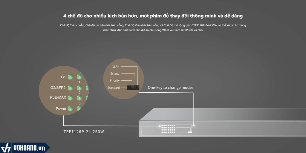 Chế độ Tiêu chuẩn, Chế độ ưu tiên dựa trên cổng, Chế độ Vlan dựa trên cổng và Chế độ mở rộng giúp TEF1126P-24-250W có thể xử lý các mạng khác nhau, đặc biệt dành cho dự án phủ sóng WI-FI và Giám sát IP vừa và nhỏ.