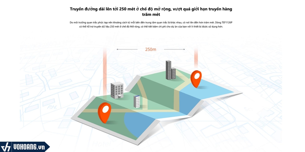 Do môi trường quan trắc phức tạp nên khoảng cách từ mỗi bến đến trung tâm quan trắc là khác nhau, có nơi lên đến hơn trăm mét. Dòng TEF1126P có thể hỗ trợ truyền dữ liệu 250 mét ở chế độ Mở rộng, có thể tiết kiệm chi phí cho dự án của bạn với ít thiết bị được sử dụng hơn.