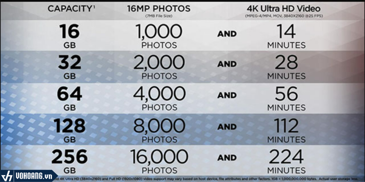 Khả năng Lưu trữ hình ảnh và 4K Ultra HD video lên đến 256GB