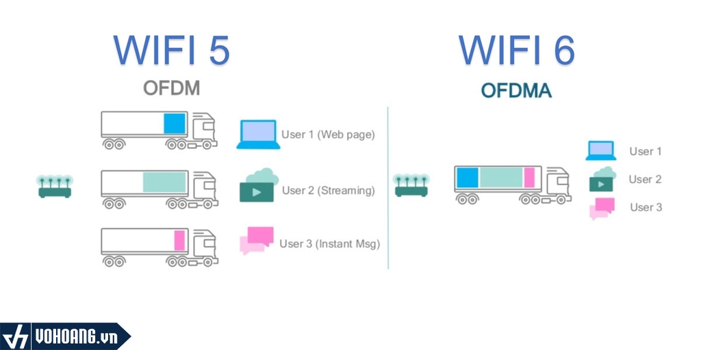 Với sử dụng công nghệ OFDMA (Orthogonal Frequency Division Multiple Access), Wi-Fi 6 chia kênh truyền thành nhiều phiên truyền nhỏ hơn, cho phép truyền đồng thời nhiều luồng dữ liệu. Điều này tạo điều kiện cho tốc độ truyền dữ liệu tăng lên đáng kể, cho phép bạn tải xuống và tải lên nhanh chóng các tệp tin lớn, xem video 4K/UHD mượt mà và trải nghiệm trò chơi trực tuyến không bị gián đoạn.