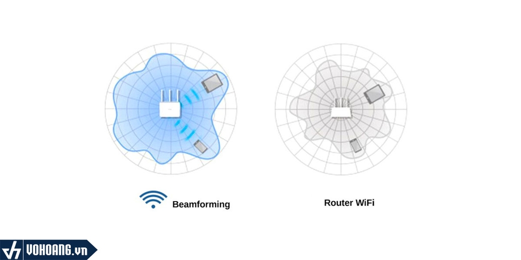 Với công nghệ Beamforming để tập trung tín hiệu Wi-Fi vào thiết bị đích. Thay vì phát tín hiệu Wi-Fi rải rác, Beamforming tạo ra một "chùm" tín hiệu mạnh hơn và tập trung hướng tín hiệu vào thiết bị cần kết nối. Điều này giúp tăng cường khả năng phủ sóng và độ mạnh của tín hiệu, đặc biệt trong các khu vực có nhiều vật cản.