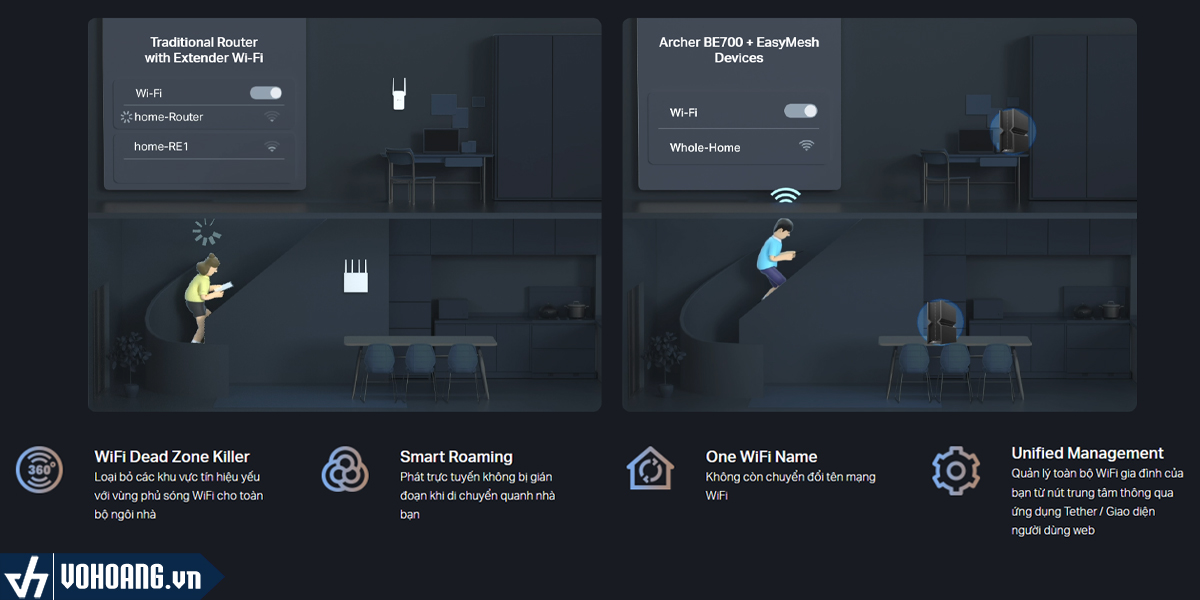 Archer BE700 là một thiết bị tương thích hoàn hảo với công nghệ EasyMesh, giúp bạn loại bỏ các vùng không có sóng WiFi trong nhà. Bằng cách kết hợp thêm một router hoặc bộ mở rộng phạm vi hỗ trợ EasyMesh, bạn có thể dễ dàng tạo ra một hệ thống WiFi lưới đa gigabit mạnh mẽ, mang lại độ phủ sóng đồng đều và ổn định cho toàn bộ không gian sống của mình.