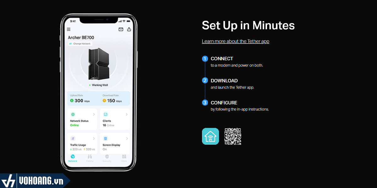 Cài đặt ứng dụng Tether và chỉ cần làm theo hướng dẫn trên màn hình. Chỉ trong ba bước đơn giản, toàn bộ ngôi nhà của bạn có thể được bao phủ trong WiFi mạnh mẽ và đáng tin cậy.