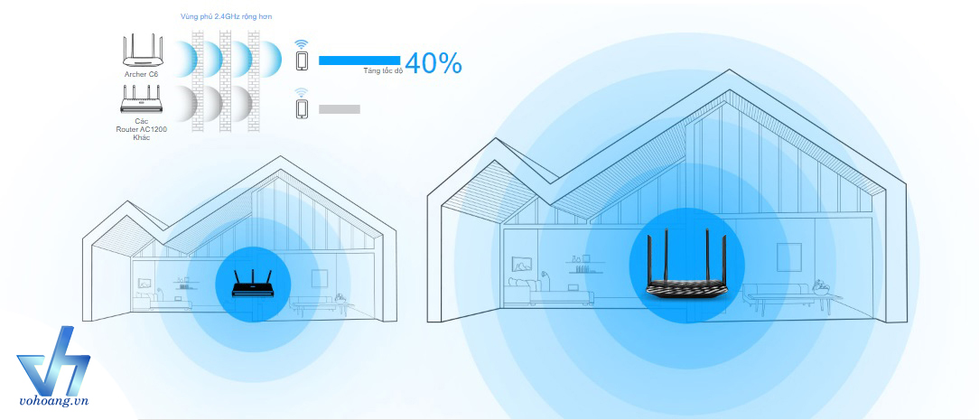 📢 Với bốn ăng ten ngoài và một ăng ten ngầm, Archer C6 có thể cung cấp vùng phủ sóng Wi-Fi vượt trội, len lỏi tới từng ngóc ngách trong ngôi nhà của bạn, giờ đây bạn có thể trải nghiệm kết nối Wi-Fi tốc độ cao ở bất cứ nơi đâu trong ngôi nhà của mình, cho dù bạn đang thư giãn trên ghế salon hay đang tận hưởng ánh năng mặt trời ngoài ban công. Với bộ xử lý mạnh mẽ, Archer C6 cung cấp vùng phủ sóng Wi-Fi 2.4GHz mạnh hơn bao giờ hết, vượt trội hơn bất cứ Router Wi-Fi nào ở cùng phân khúc.