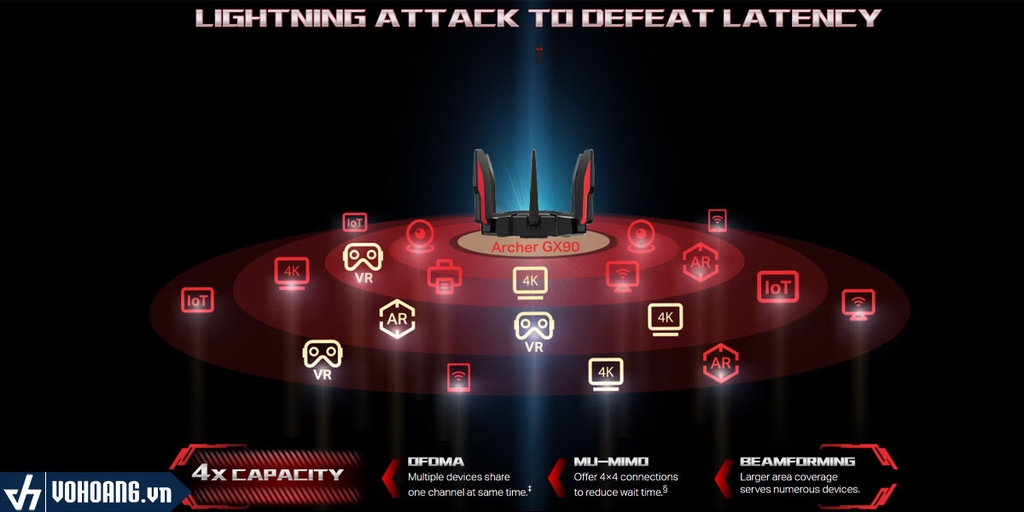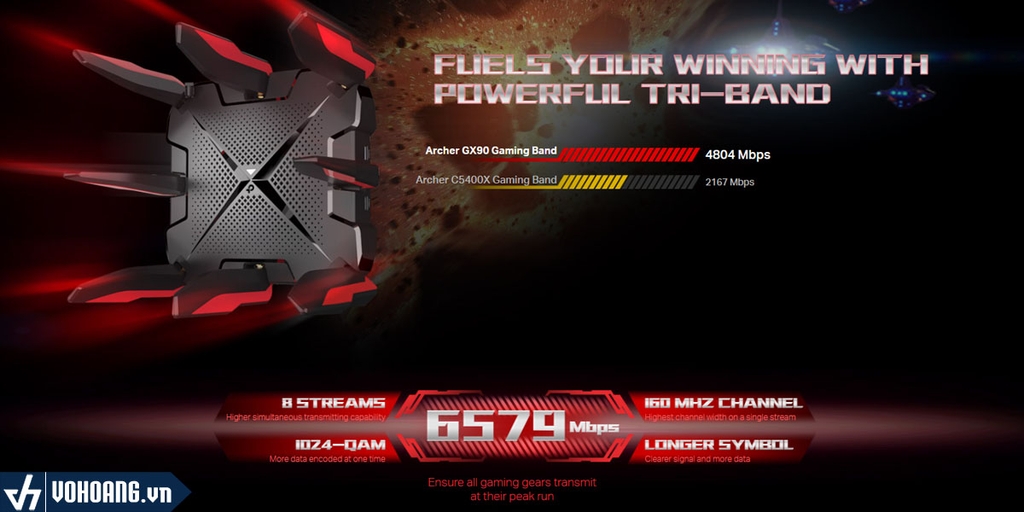 Archer GX90 cung cấp 3 băng tần riêng biệt với tốc độ tổng hợp lên tới 6579 Mbps, trang bị đầy đủ tính năng như công nghệ 4T4R và HE160, cung cấp cho tất cả các thiết bị chơi game của bạn ở tốc độ tối đa 4804 Mbps và ngăn chặn sự can thiệp từ các thiết bị khác.