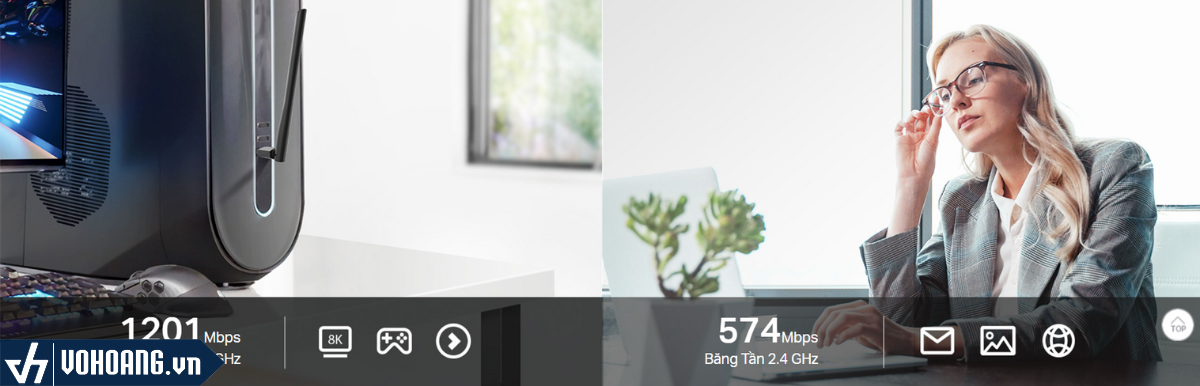WiFi 6 Siêu Nhanh – Trải nghiệm video mượt mà với tốc độ không dây 1800 Mbps (1201 Mbps trên băng tần 5 GHz + 574 Mbps trên băng tần 2.4 GHz)