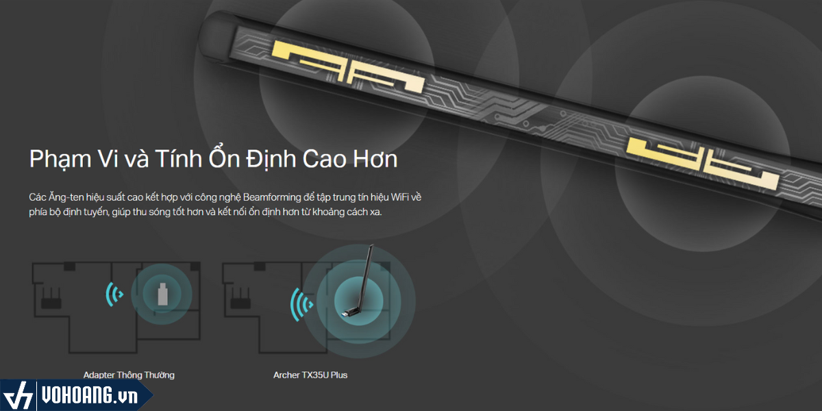Các Ăng-ten hiệu suất cao kết hợp với công nghệ Beamforming để tập trung tín hiệu WiFi về phía bộ định tuyến, giúp thu sóng tốt hơn và kết nối ổn định hơn từ khoảng cách xa.