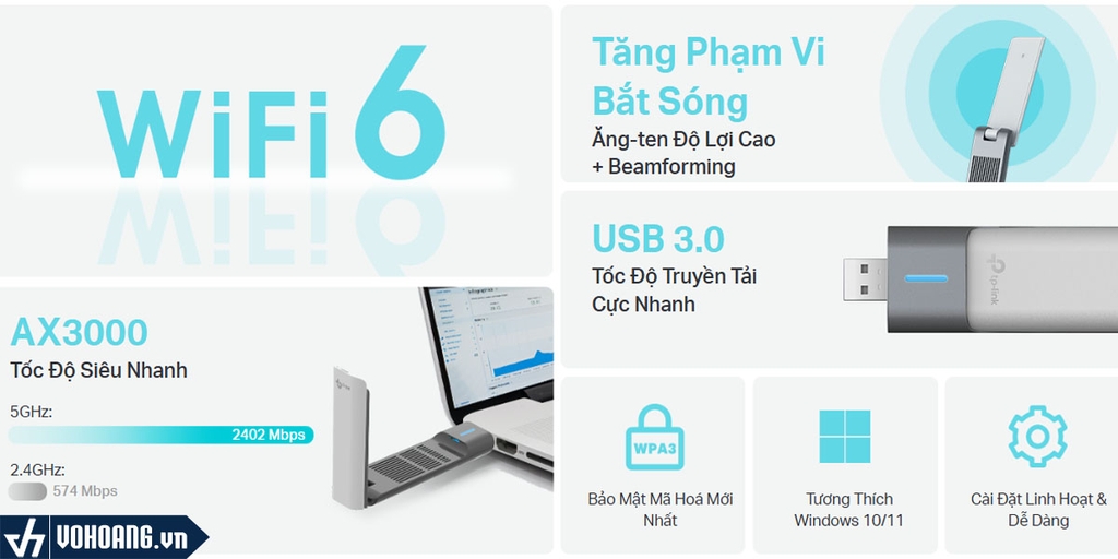 Archer TX50UH - Giải pháp kết nối wifi tốc độ cao cho Laptop/PC sợ hữu công nghệ Wi-Fi 6 với băng thông AX3000 cho kết nối nhanh chóng mượt mà. Archer TX50UH linh hoạt trong cách sử dụng bằng cách cắm sử dụng trực tiếp hoặc thông qua chân đế để bàn nhỏ gọn, hiện tại với chuẩn USB 3.0 xử lý tín hiệu cực nhanh. Hạn chế duy nhất của Archer TX50UH là chỉ tương thích với hệ điều hành Windows, hy vọng trong các phiên bản cập nhật sắp tới sẽ hỗ trợ thêm MacOs, Linux...