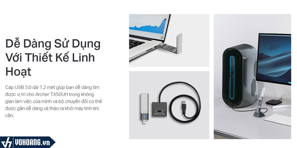 Cáp USB 3.0 dài 1,2 mét giúp bạn dễ dàng tìm được vị trí cho Archer TX50UH trong không gian làm việc của mình và bộ chuyển đổi có thể được gắn dễ dàng và tháo ra khỏi máy tính khi cần.