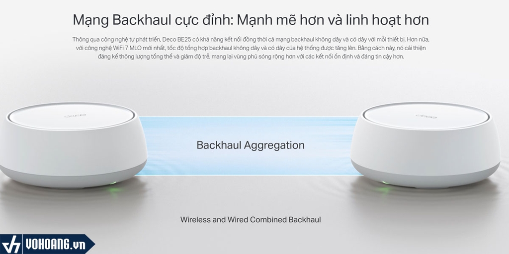 Nhờ phát triển của công nghệ, Deco BE25 có khả năng kết nối đồng thời cả mạng backhaul không dây và có dây với mỗi thiết bị. Hơn nữa, với công nghệ WiFi7 MLO mới nhất, tốc độ tổng hợp backhaul không dây và có dây của hệ thống được tăng lên. Bằng cách này, nó cải thiện đáng kể thông lượng tổng thể và giảm độ trễ, mang lại vùng phủ sóng rộng hơn với các kết nối ổn định và đáng tin cậy hơn.