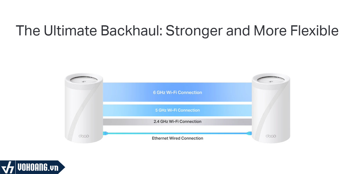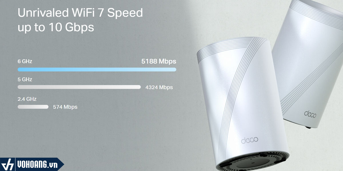 Deco BE63 được trang bị ba băng tần, bao gồm một băng tần 6 GHz với tốc độ 5188 Mbps, một băng tần 5 GHz với tốc độ 4324 Mbps và một băng tần 2.4 GHz với tốc độ 574 Mbps. Sự kết hợp này cho phép hệ thống mesh phân phối tín hiệu Wi-Fi mạnh mẽ và đồng đều khắp mọi ngóc ngách trong nhà bạn, từ tầng hầm đến gác mái.