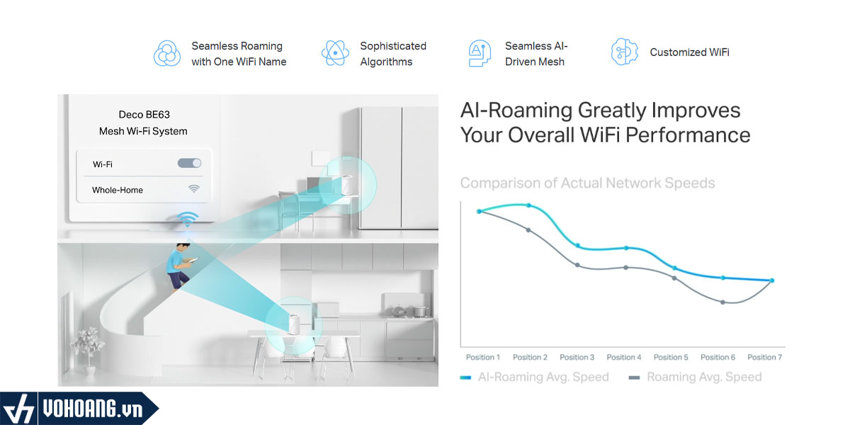 Deco Mesh tạo thành một mạng thống nhất với một tên mạng duy nhất. Với công nghệ AI-Roaming tích hợp, giúp tạo ra giải pháp WiFi lý tưởng với các thuật toán tiên tiến và tự học.