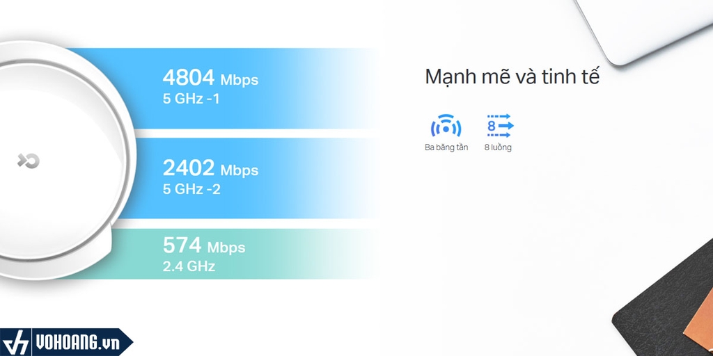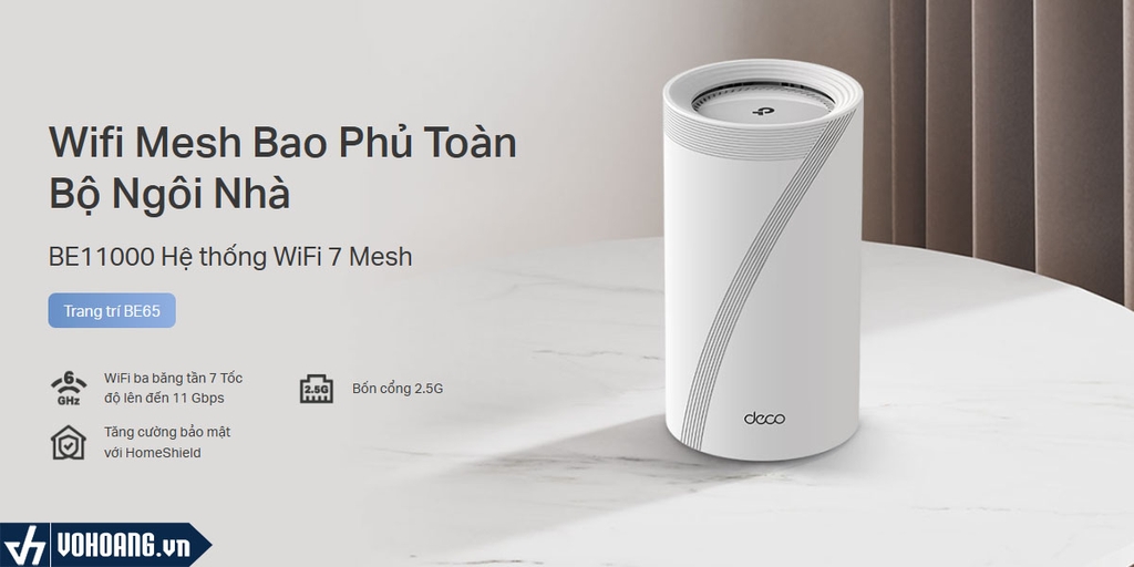 TP-Link Deco BE65 với chuẩn BE11000 tốc độ cao gigabit hỗ trợ 3 băng tần gồm 6Ghz(802.11be), 5Ghz(802.11be) và 2.4Ghz(802.11ax). Tổng băng thông lên đến 1.2Gbps siêu nhanh, công nghệ AI-Driven Mesh, 4 ăng-ten ngầm cho độ lợi cao, 2x2 MU-MIMO, OFDMA, 6 Streams,...