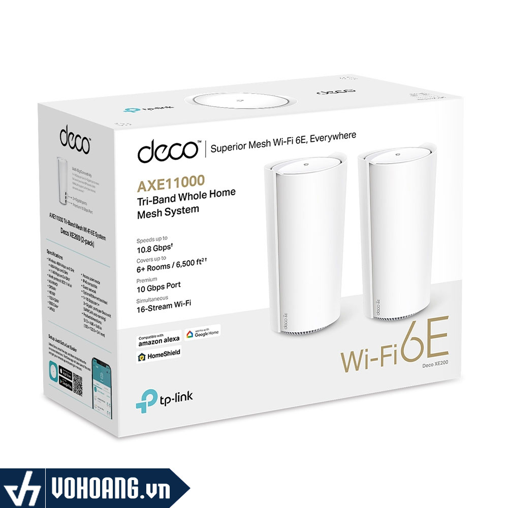 Deco XE200 với chuẩn AXE11000 tốc độ cao hỗ trợ 3 băng tần gồm 6Ghz, 5Ghz và 2.4Ghz. Nhiều công nghệ được tích hợp giúp năng suất và hiệu suất hoạt động mạnh mẽ như HE160, 16 Streams mạnh mẽ, 8x8 MU-MIMO. Deco XE200 hỗ trợ kết nối lên đến 200 thiết bị cùng lúc, tích hợp thuật toán AI giúp nhận diện và trao đổi thông tin thông minh giúp hoạt động ổn định hơn.