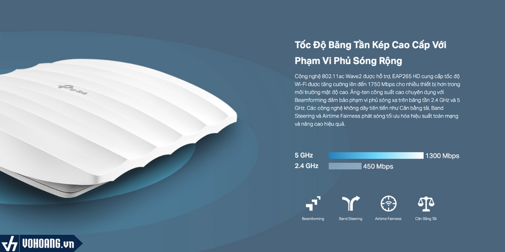 Công nghệ 802.11ac Wave2 được hỗ trợ, EAP265 HD cung cấp tốc độ Wi-Fi được tăng cường lên đến 1750 Mbps cho nhiều thiết bị hơn trong môi trường mật độ cao. Ăng-ten công suất cao chuyên dụng với Beamforming đảm bảo phạm vi phủ sóng xa trên băng tần 2.4 GHz và 5 GHz. Các công nghệ không dây tiên tiến như Cân bằng tải, Band Steering và Airtime Fairness phát sóng tối ưu hóa hiệu suất toàn mạng và nâng cao hiệu quả.