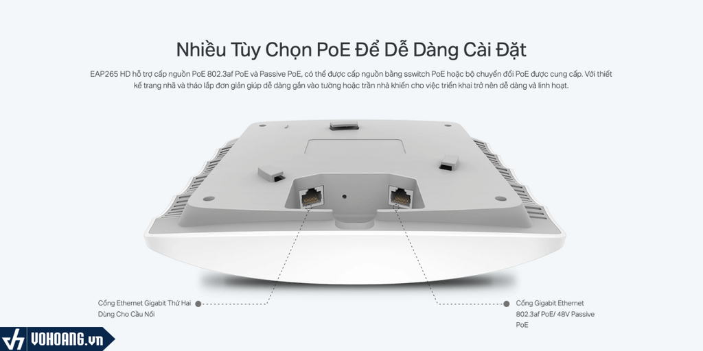 EAP265 HD hỗ trợ chuẩn cấp nguồn PoE 802.3af PoE và PoE Passive, có thể cấp nguồn bằng switch PoE hoặc bộ chuyển đổi nguồn PoE giúp triển khai linh hoạt và dễ dàng hơn.