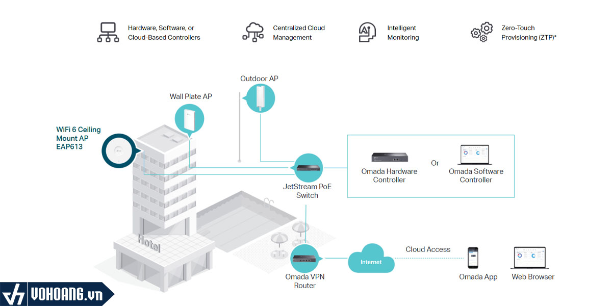Nền tảng SDN của Omada là giải pháp tích hợp hoàn hảo cho việc quản lý mạng trung tâm qua đám mây, kết nối các thiết bị như điểm truy cập, switch và router. Điều này không chỉ đơn giản hóa quá trình quản lý mà còn nâng cao khả năng mở rộng của mạng, tất cả thông qua một giao diện thống nhất.