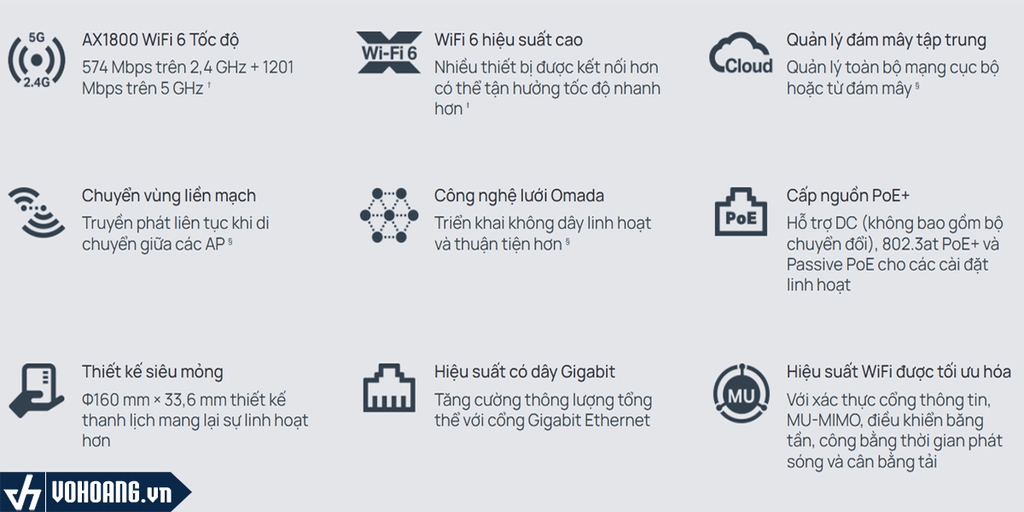 | Quản lý tập trung | • Bộ điều khiển dựa trên đám mây Omada • Bộ điều khiển phần cứng Omada OC300 • Bộ điều khiển phần cứng Omada OC200 • Bộ điều khiển phần mềm Omada |