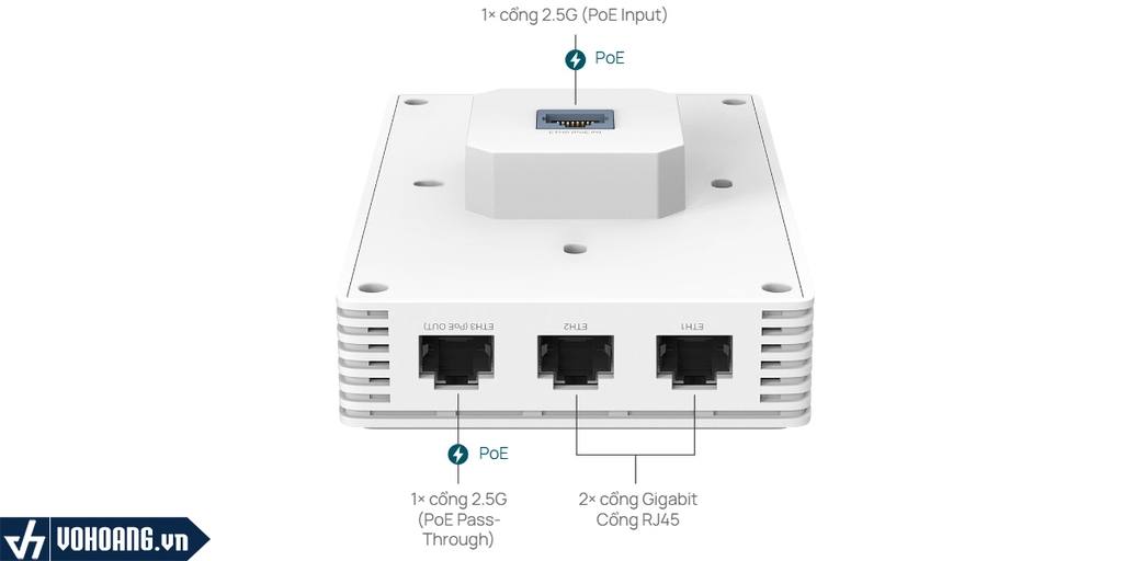 | Cổng kết nối | • Uplink: 1× Cổng Ethernet 2.5G • Downlink: 1× Cổng Ethernet 2.5G + 2× Cổng Ethernet Gigabit (Cổng 2.5G hỗ trợ cấp nguồn PoE. Tính năng cấp nguồn PoE yêu cầu đầu vào 802.3at/bt. Nếu mức tiêu thụ điện năng của thiết bị hạ lưu của AP vượt quá 7W, AP cần đầu vào 802.3bt.) |