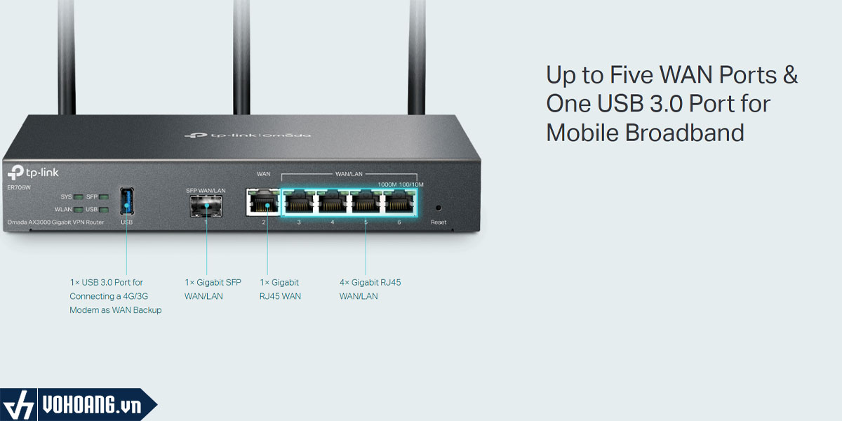 ER706W là một thiết bị không thể thiếu cho các doanh nghiệp với 6 cổng Ethernet Gigabit, trong đó có 1 cổng SFP gigabit và 5 cổng RJ45 gigabit, đem đến khả năng kết nối mạng có dây siêu tốc. Ngoài ra, cổng USB 3.0 còn hỗ trợ kết nối băng thông rộng di động qua modem 4G/3G, mang lại giải pháp dự phòng đáng tin cậy cho mọi nhu cầu truy cập internet.