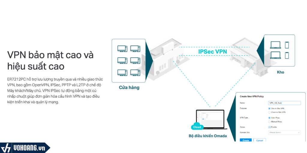 ER7212PC hỗ trợ lưu lượng truyền qua và nhiều giao thức VPN, bao gồm OpenVPN, IPSec, PPTP và L2TP ở chế độ Máy khách/Máy chủ. VPN IPSec tự động bằng một cú nhấp chuột giúp đơn giản hóa cấu hình VPN và tạo điều kiện triển khai và quản lý mạng.